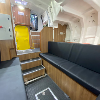 San Cibrao is powered by a pair of Volvo D9 engines rated at 425hp and has a maximum speed of 23.5kts. She is heavily fendered all round and incorporating Safehaven’s sacrificial fender system protecting the vessel at her boarding area and softening the inevitable hard impact that can occur in poor conditions. Safehaven’s proven MOB recovery system is fitted on the transom allowing a casualty to be easily recovered in a MOB situation. A full suite of Furuno electronics are installed at her central helm position and she provides seating for 4 pilots on CAB suspension seats in her very nicely fitted out main cabin, which provides a comfortable relaxed environment for pilots and crew during transfers with additional accommodation in her f/wd cabin incorporating seating and berths, a separate heads compartment, dedicated electrical room and galley area.