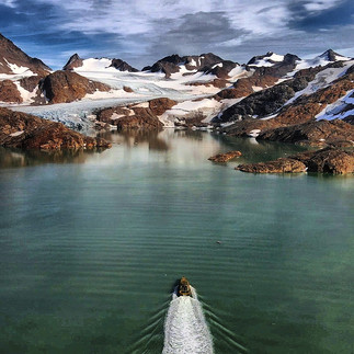 On Monday we headed North along the coast to the small settlement of Kulusuk with its population of 200 people. Just North of Kulusuk Island we were informed was a smaller glacier that could be reached by boat, so this was to be our destination as I was determined to get to a glacier. And indeed we did reach it, lying between two mountains the glacier meandered down to meet the waters at the edge of its fjord, allowing us to get close to it and fly our drone out over the glacier to capture some wonderful footage of its jagged ice that had been travelling down from the ice cap for thousands of years.